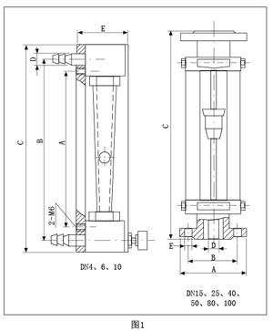 ZH-LZB/LZB-( )F流量計(jì)的錐管為光滑內(nèi)壁管(見(jiàn)圖4),通徑DN15以上的流量計(jì),浮子通過(guò)導(dǎo)桿 上下移動(dòng),保持穩(wěn)定;ZH-LZJ/LZJ-( )F流量計(jì)錐管 內(nèi)壁有三條導(dǎo)向凸筋,使浮子保持穩(wěn)定(見(jiàn)圖4)。通徑DN10以下的流量計(jì)采用軟管連接,配有針形流量調(diào)節(jié)閥;通徑DN15以上流量計(jì)采用法蘭連接。