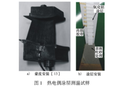薄膜熱電偶測溫等。由于熱電偶具有結構簡單.制造方便、測量范圍廣、精度高、慣性小和輸出信號便于傳輸等諸多優點,一直都是航空發動機葉片測溫的主要測量元件。通過熱電偶測量葉片表面溫度的主要難點在于安裝和制備方法。由于葉片表面光滑,傳統使用中熱電偶是通過填埋或金屬蒙皮的方法固定在金屬表面的。采用填埋安裝時,由于葉片厚度方向的溫度梯度,測量點溫度難以與表面保持一致,因而無法準確測量葉片表面溫度,此外還會造成試件表面的破損。而采用金屬蒙皮焊接固定又會導致熱電偶受感部周圍存在縫隙,造成較大的接觸熱阻。為解決傳統熱電偶安裝方法中存在的弊端,提高渦輪葉片表面溫度測量的精度,一種將熔融態耐高溫絕緣材料Al2O3粉末直接噴涂至渦輪葉片基底上的熱電偶安裝方案,簡稱為涂層測溫。該方案的工藝流程為:①表面吹沙處理,增加待測表面粗糙度;②使用高能等離子噴槍噴涂Al2O3粉末,材料,形成絕緣層;③利用高溫膠帶和等離子材料噴涂工藝完成功能層制備;④利用高溫膠帶和Al2O3粉末制備保護層;⑤通過平行微隙焊接工藝和激光焊接技術完成熱電偶裸絲與后端高溫補償導線連接,最后將高溫膠帶揭去,完成涂層制作。