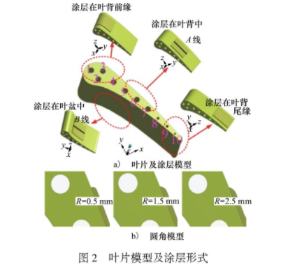 典型的熱電偶涂層安裝試件如圖1所示。根據.熱電偶涂層的結構,在MarkI葉片模型上,建立了4個涂層的典型位置,分別位于葉背前緣、葉背中、葉背后緣、葉盆處,標準的涂層尺寸為50mmx50mmx1mm。葉片模型及涂層的位置如圖2所示。其中,圖2a)中2處黑線位于涂層下方葉片表面50%葉高處,表示實際使用中熱電偶測量點可能處于的位置,命名為A線和B線。考慮到涂層多采用噴涂形式,邊緣一般會帶有一定的圓角,為研究圓角半徑R對測量點附近溫度的影響,在1mm厚度涂層模型的基礎上建立了3種圓角形式,如圖2b)所示。