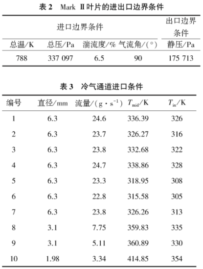 選用5411號試驗工況,其進出口邊界條件如表2所示。葉片中有10個徑向圓柱形對流冷卻孔,其直徑,冷卻氣體質量流量、中徑處平均總溫Tmid和冷卻氣體進口總溫Tin見表3,冷卻氣體出口靜壓為175713Pa。