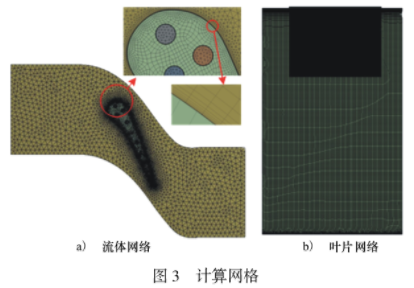 對湍流的模擬選用Menter和Langtry提出的間歇因子與動量厚度的雷諾數雙方程SST-γ-θ湍流模型[2]。該轉捩模型是基于局部變量的轉捩模型,并對前人提出的模型作了較大改進,通用性和準確性都得到很大提高[23]。網格采用ANSYS-Workbench提供的Mesh工具進行劃分。由于邊界層內流體的速度和溫度變化較大,需要對邊界層內網格進行加密。根據進出口條件估算葉片附近氣體的雷諾數為10量級,為滿足SST-γ-θ模型計算精度要求,需要y*數盡可能接近于1。根據CFD-Online提供的y'計算器的估算結果[24],將近壁面第一層網格厚度劃分為1μm,此后每層間距以1.5的比率增加,共劃分了15層近璧面網格。在葉片冷卻通道內以同樣方法生成近壁面網格,其第一層網格厚度為0.01mm,增長比為1.5,共15層。燃氣區采用混合網格劃分,葉片和涂層部分則采用以六面體為主導的網格劃分。涂層部分在涂層厚度方向上劃分為10層網格,在流-固、固-固交界面網格進行加密。網格交界面數據采用generalgridinterface(GGI)格式傳遞。經網格獨立性試驗選擇網格總數約為908萬。其中,流體網格為775萬、葉片網格為70萬、涂層網格為64萬,網格如圖3所示。
