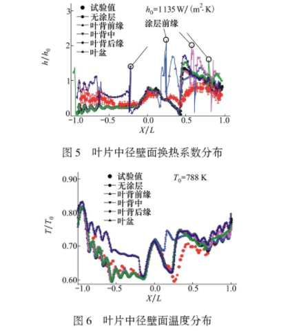 如圖6所示,激波附近葉片表面溫度突然下降后急劇上升,原因是轉捩點附近發生附面層分離,氣體內能向動能轉化,燃氣溫度下降。激波后附面層重新生成,氣體的湍流動能得到加強,換熱速度增加,溫度上升。由圖5和圖6可知,無涂層葉片表面中徑處傳熱系數h和無量綱的靜溫T的分布趨勢與實驗相仿,盡管在吸力面有一定偏差,但多數偏差點小于10%,在可接受范圍內。