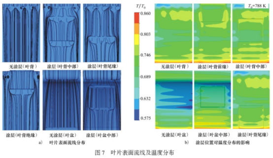 涂層在葉片不同位置時的表面流線分布及表面溫度分布如圖7所示。如圖7a)所示,葉片表面的流線在涂層周圍形成繞流,在涂層前后緣形成漩渦。當葉片表面覆蓋涂層時,表面流動狀態與流體流動時遭遇障礙物的情況相似。根據張俊婷等人[28]的研究,當流體流經長方體障礙物時,在障礙物的最高點處即出現邊界層分離,且長方體的回流區比半圓形障礙物和流線型障礙物大。由于涂層的結構近似為長方體,故在涂層的前壁面最高點處也會發生邊界層分離現象,分離點的氣體流速及換熱系數波動較大。如圖4和圖5所示,涂層前緣和尾緣均出現較大的壓力和傳熱系數波動。盡管局部的傳熱系數較大,但相對于整個涂層邊緣處的面積很小,經過涂層的展向傳熱(固體導熱)邊緣處的溫度分布仍比較均勻。如圖7b)所示,涂層邊緣處溫度略微升高,可以推斷實際使用中測量點靠近涂層邊緣時,可能導致測量值偏大。