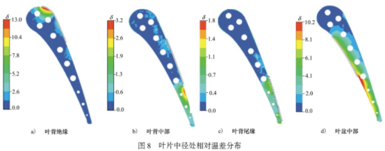 圖8為涂層位于不同位置時,葉片中徑面的相對溫差分布。由圖中可知,涂層處葉片溫度明顯升.高,當涂層位于葉背前緣時,溫度波動最大,相對溫差達到12.8%。根據圖4至圖6的計算結果,涂層.前緣位于轉捩點附近時,易發生速度邊界層分離造成較大的溫度波動。使用涂層測溫時應避免涂層前緣位于轉捩點附近。同時,可以觀察到涂層的前緣和尾緣處,葉片溫度明顯高于其他位置。