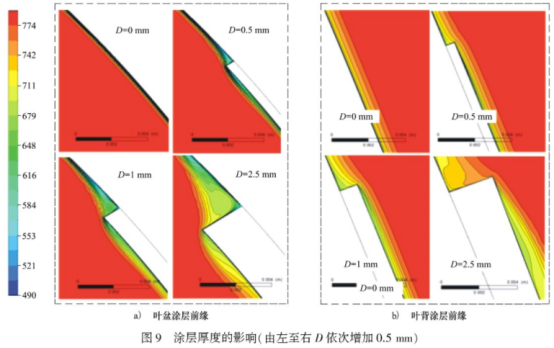 式中,υ為氣體的流速。為分析涂層對葉片對流換熱的影響,定義總溫邊界層的厚度為從物面到約等于99%外部流體總溫處的垂直距離。取涂層前緣周圍6mmx8mm的局部區域為分析對象,其近壁面氣體總溫的分布形式如圖9所示。