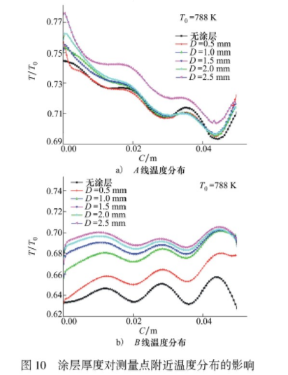 如圖12a)所示,當位于葉背中部的涂層前端為圓角時,受到激波的影響,沿燃氣流動方向涂層區的溫度先偏小再增大。如圖12b)所示當位于葉盆區中部的涂層前緣為圓角時,沿燃氣流動方向的溫度.同樣呈現先偏小再偏大的規律,但兩者的作用機理是不同的。當葉盆區的涂層前緣為圓角(流線型)時,涂層前端不會發生激波。此時,涂層對葉盆區測溫的影響僅體現為涂層自身的隔熱作用。由于葉盆面的對流換熱速度較低,涂層起到了明顯的隔熱作用。