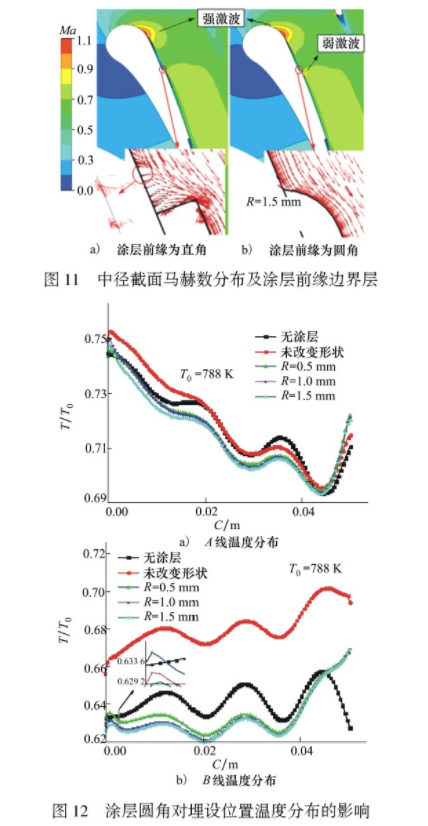 圖11為涂層前緣平面垂直于葉片表面和涂層前緣為圓角時的馬赫數分布圖。當涂層前緣平面與葉片表面垂直時,涂層前緣的平面阻礙了流體的運動。氣體直接撞擊涂層的前緣,形成了很小的氣旋(如圖11中速度矢量圖所示),氣旋消耗了氣體的動能并降低了氣體的流速,因而流過垂直涂層壁面的氣流沒能加速形成激波。當涂層前緣為圓角時,流線型的涂層前緣減小了氣動阻力。在這種情況下氣體的流速進一步增加,在流經涂層前緣后形成了一個弱激波。與葉背前緣的強激波相似,燃氣流經涂層前緣的弱激波后,燃氣的溫度先下降后升高。