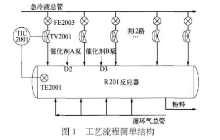 某化工裝置聚合反應(yīng)器由氣體及液體循環(huán)回路控制,反應(yīng)器在66℃,2.2MPa下操作,液體物料作為冷卻劑噴灑到反應(yīng)器床層氣化后吸收聚合反應(yīng)熱,通過(guò)控制液體的流量來(lái)控制恒定的聚合溫度。反應(yīng)器的溫度控制器直接控制急冷液調(diào)節(jié)閥的閥位輸出,急冷液調(diào)節(jié)閥根據(jù)溫度測(cè)量值的變化,通過(guò)改變閥位控制加入該區(qū)域的急冷液流量來(lái)穩(wěn)定溫度,采用Pt100電阻體測(cè)量工藝流程如圖1所示。工藝生產(chǎn)反應(yīng)器溫度過(guò)低聚合不反應(yīng),過(guò)高容易爆聚,溫度控制對(duì)產(chǎn)品質(zhì)量和裝置安全生產(chǎn)非常關(guān)鍵,因此,工藝溫度控制要求誤差在±1之內(nèi)。催化劑加入量大小是控制反應(yīng)速度的重要指標(biāo),從聚合反應(yīng)機(jī)理來(lái)講,溫度升高會(huì)導(dǎo)致催化劑性能的衰減,溫度過(guò)低又不反應(yīng),若大量加入催化劑,一旦到達(dá)反應(yīng)條件(溫度),會(huì)劇烈反應(yīng),易造成反應(yīng)器溫度控制失控,反應(yīng)器爆聚的可怕結(jié)局。催化劑價(jià)格極其昂貴,因此,精確的溫度測(cè)量對(duì)裝置很重要。