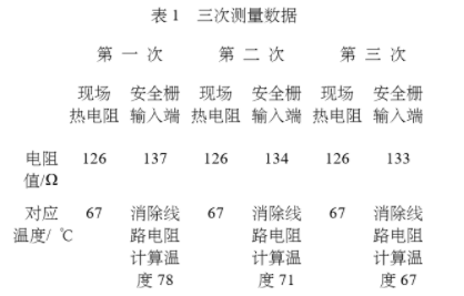 因測(cè)溫回路無(wú)過(guò)多元件,通過(guò)更換智能溫度安全柵、緊固現(xiàn)場(chǎng)接線端子,儀表恢復(fù)正常使用。儀表人員在故障檢查過(guò)程中詳細(xì)記錄如下數(shù)據(jù):第一次先在安全柵輸入端測(cè)量阻值、再測(cè)量現(xiàn)場(chǎng)阻值,現(xiàn)場(chǎng)和機(jī)柜室采用3X1.5mm