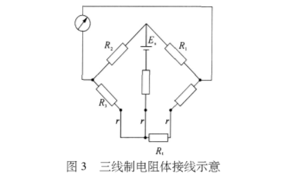 熱電阻的接線方法有兩線制.三線制、四線制方式。兩線制不能消除因引線電阻的變化所引起的測(cè)量誤差,一般不用;三線制在配合電橋電路測(cè)溫時(shí),可以減小或消除因引線電阻變化所引起的測(cè)溫誤差,應(yīng)用比較廣泛;四線制通常用于標(biāo)準(zhǔn)鉑電阻,用于配合電位差計(jì)測(cè)量電阻時(shí),消除引線電阻的影響,在精度高測(cè)量場(chǎng)合使用。采用三線制是為了消除連接導(dǎo)線電阻引起的測(cè)量誤差,這是因?yàn)闇y(cè)量熱電阻的電路一-般是不平衡電橋。熱電阻作為.電橋的一個(gè)橋臂電阻,其連接導(dǎo)線(從熱電阻到中控室)也成為橋臂電阻的一部分,這一部分電阻是未知的且隨環(huán)境溫度變化,造成測(cè)量誤差。采用三線制,將導(dǎo)線一根接到電橋的電源端,其余兩根分別接到熱電阻所在的橋臂及與其相鄰的橋臂上,這樣消除了導(dǎo)線線路電阻r帶來(lái)的測(cè)量誤差,如圖3所示。