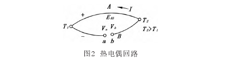 熱電偶是工業(yè)過程測溫的主要元器件,主要的工作原理為塞貝克效應,當兩種不同的導體A、B在一端焊接組成閉合回路時,如果兩接觸點處于不同溫度,則回路中存在電流流動,此回路為熱電回路,出現(xiàn)的電流為熱電流(如圖2所示)。