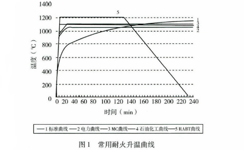 GB/T9978.1-2008《建筑構件耐火試驗方法第1部分:通用要求》和GA/T714-2007《構件用防火保護材料快速升溫耐火試驗方法》中規定了幾種常用的升溫曲線,即標準升溫曲線(簡稱標準曲線)、電力耐火試驗升溫曲線(簡稱電力曲線)、隧道耐火試驗HC升溫曲線(簡稱HC曲線)、石油化工耐火試驗升溫曲線(簡稱石油化工曲線)和隧道耐火試驗RABT升溫曲線(簡稱RABT曲線),具體情況見圖1。