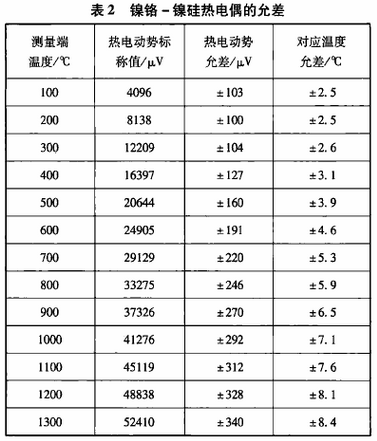 鎳鉻-鎳硅熱電偶的電動勢及允差做了詳細的規定,通過換算我們可以得到其對應的溫度允差范圍,具體見表2。