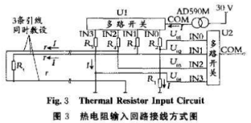 信號處理單元由熱電阻Rt.AD590M、標準電阻R1、多路模擬開關U1和U2等組成。圖中r是熱電阻引線等效電阻。標準電阻R1用錳銅絲繞制而成,性能穩定。AD590M用作標準電流源,其輸出電流I經多路模擬開關U1分別由4個支路輸出,在R:上形成標準校準電壓信號Uo1、在熱電阻R..上形成輸人信號U02,在引線電阻2r上形成引線電阻補償信號U03,在接地線上形成零點校正信號U04。為了提高測量精度,電路設計時讓4個支路負載電阻盡量相同,熱電阻采用三線制連接,3條引線敷設環境和長度相同,見圖3。
