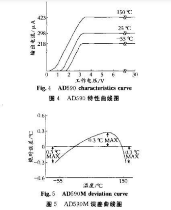 AD590是美國模擬器件公司生產的單片集成兩端感溫電流源,測溫范圍為-55~+150℃,其特性為輸出電流I用微安表示時等于器件所處環境的熱力學溫度(開爾文)度數,工作電源電壓范圍為4~30V。AD590M精度最高,全測量范圍最大絕對誤差在25℃時校準后僅為±0.3C2,在0~50C最大誤差為±0.1℃,也即±0.1μA,其特性和誤差曲線見圖4和圖5。