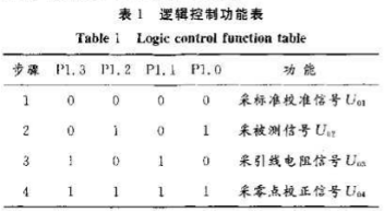數據采集及處理單元由12位A/D轉換器、單片計算機、數碼顯示和串口等組成.主要完成邏輯控制、數據采集、運算處理、分度表查詢、報警、溫度顯示和溫度數據串口輸出等功能,見圖2。邏輯控制和數據采集可由表I說明。設S3,S4分別為U03,U04的采樣值,由式(5)可得熱電阻和引線電限分別為