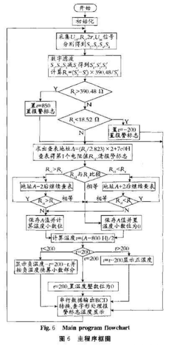 系統軟件主要完成多路模擬開關的邏輯控制、信號采集、熱電阻計算.引線電阻補償、由分度表查詢溫度值、溫度點之間的參考溫度計算、越限報警、溫度值申行數據輸山和溫度顯示等功能。主程序框圖見圖6。程序采用模塊化結構,每一個功能為一個子程序。Pt100熱電限分度表從一200℃到850℃共1051個溫度點,每個溫度點的熱電阻值以10mΩ為單位,用16進制數存于2個字節中,共占2102個字節,分度表存放于系統程序之后,分度表相對地址除2即為對應的溫度值。溫度與熱電阻之間的特性曲線見圖7。