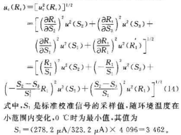 (13)式即是本裝置計算熱電阻的基本關系式。數據采集及處理系統在單片機控制下完成數據采集后,即按(13)式計算熱電阻值,然后查分度表求出溫度值輸出和顯示。式中R1-390.48Ω,溫度值顯示到小數點后1位.兩溫度點之間按線性內插計算參考溫度。實際計算時S1,S2,S3先減去零點校正值S4后,再代入式(13)計算熱電阻值。
