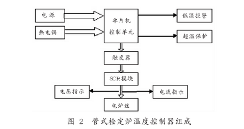 檢定爐溫度控制器,是對檢定爐溫度進行控制的儀器,主要由單片機控制單元、觸發器、SCR模塊、報警器、電流電壓顯示儀表以及交流接觸器、控制按鈕等組成,可以與計算機通訊,接受計算機的指令。根據熱電偶輸出的mV信號,經過一系列的處理后轉換成溫度值,通過LED顯示出來,再與設定溫度進行比較,確定輸出電流的大小,從而自動地控制爐內溫度,圖2為管式檢定爐溫度控制器組成。檢定爐的加熱電流由SCR模塊來調節,而SCR模塊則由脈沖移相觸發器產生的移相脈沖來控制。觸發器是模塊化的,輸入標準信號,如:4~20mA電流信號、0~10V或0~5V電壓信號等,輸出移相脈沖,電壓大小根據控溫信號的大小而決定,控溫信號與檢定爐加熱絲兩端電壓0~220V基本上成線性對應關系。