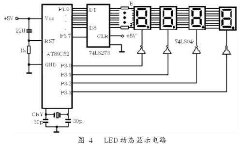 圖4為LED動態顯示電路。根據控制系統的要求,選用4位LED顯示,此電路中,采用動態掃描方式。74LS273用于驅動LED的8位段碼,8位LED相應的“a”~“g”段連在一起。74LS04反相驅動的輸出端,用于驅動4位LED的位碼,這樣當選通某一位LED時,相應的地址線(74LS04輸出端)輸出的.是高電平,所以,LED選用共陽LED數碼管。動態掃描的頻率有一定的要求,頻率太低,LED將出現閃爍現象;如頻率太高,由于每個LED點亮的時間太短,LED的亮度太低,肉眼無法看清。所以一般保持時間取數個毫秒左右為宜。