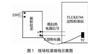 現(xiàn)場校準(zhǔn)受條件限制,不便進行冷端冰點補償這樣會造成測量結(jié)果偏高。因此必須測量出冷端環(huán)境溫度對測量結(jié)果進行修正。本文采用FLUKE744過程校準(zhǔn)儀作為標(biāo)準(zhǔn)器其精度滿足現(xiàn)行規(guī)程對標(biāo)準(zhǔn)器的要求,它自帶的熱電偶探頭可以同步測量并顯示冷端環(huán)境溫度減少了所用儀表數(shù)量。所選被校儀表顯示分辨力為1℃允許誤差為±5℃。現(xiàn)場校準(zhǔn)接線如圖1所示。