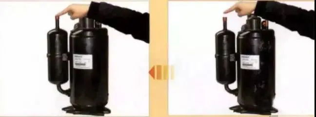 首先,將壓縮機(jī)卸下, 加電使其運(yùn)轉(zhuǎn),用手指堵住壓縮機(jī)的排氣孔片刻, 再將手指移開。 由于壓縮機(jī)內(nèi)有壓力, 所以當(dāng)用手堵住壓縮機(jī)的排氣孔時, 應(yīng)感到有排氣壓力;當(dāng)把手指移開時, 可以聽到 “呲呲的排氣聲, 而且排氣壓力正常的壓縮機(jī),應(yīng)很難堵住壓縮機(jī)排除的氣體,這表明壓縮機(jī)性能良好。如果用手堵住排氣管時感覺不到壓力, 將手指移開時,聽不到排氣聲, 則說明該壓縮機(jī)性能不良。如下圖所示: