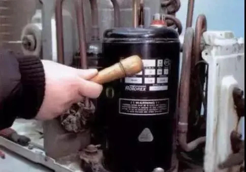 一般選擇木錘或者就地選擇可用物件。在壓機(jī)啟動時重錘敲擊其身上的三個焊點(diǎn)。但要注意力道,不能敲變形。輕輕地敲擊壓縮機(jī)外殼,把卡住部位稍微振松,有時可啟動運(yùn)轉(zhuǎn)或把電源電壓往上調(diào)高10%,多次啟動沖擊,這個方法可解決潤滑不夠的卡缸現(xiàn)象,對旋轉(zhuǎn)式壓縮機(jī)特別有效。