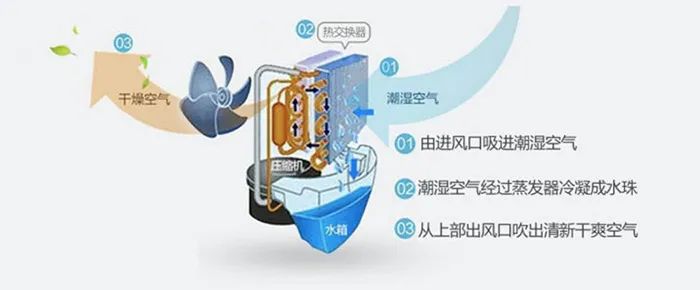 在正常開機的情況下通過風機的運行潮濕的空氣從進風口吸入經過蒸發器蒸發器將空氣中的水附在鋁片上變成干燥的空氣經過冷凝器散熱從出風口吹出。