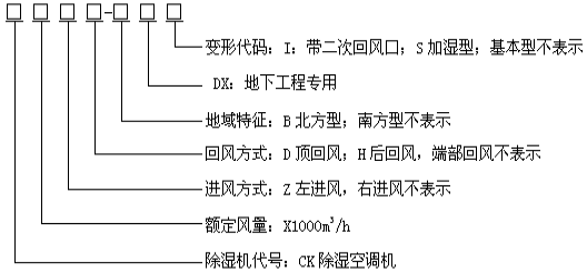 型號示例: CK12-DX 表示名義風量為12000m3/h,回風方式為端部回風的南方型地下工程用除濕空調機,面對機組控制器,回風口在右側。