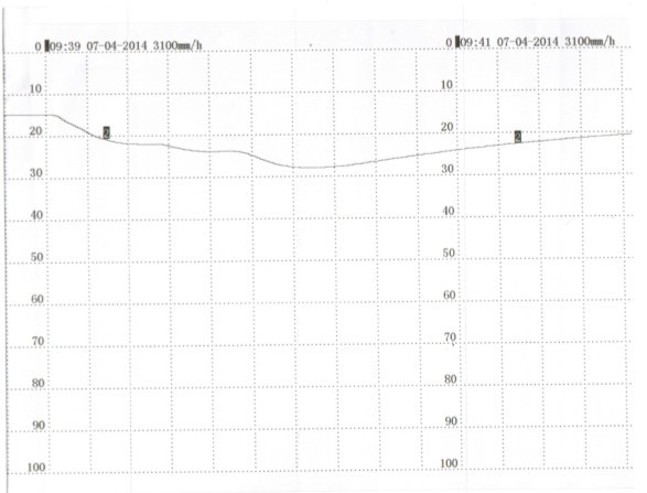 4.記錄功能:采用進口固定式熱敏頭,無筆墨消耗,無筆位誤差,抗震動;在100mm范圍內(nèi)有800個熱印點對測量值進行趨勢記錄和數(shù)字記錄,在記錄曲線同時打印標尺刻度及每個通道標記,每隔100mm打印一次刻度值、當前時間和走紙速度。