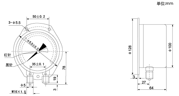 雙針壓力表的外形結(jié)構(gòu)尺寸: