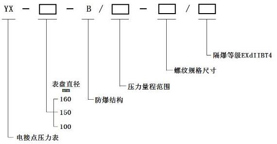YX-160B(150B 100B)防爆電接點壓力表由隔爆外殼、測量系統、電接點組、調節裝置和出線盒等組成。防爆電接點壓力表的隔爆外殼具有良好的隔爆性能,因此防爆電接點壓力表對在正常工作過程中由于火花或電弧的影響,除了能承受殼體內部的爆炸性氣體混合物在一旦引起爆炸時產生的爆炸壓力外,并能有效地阻止由此產生的熱能向外順利傳播,而只能在殼體內部沿著隔爆接合面的微小縫隙處緩慢地向外擴散。這時,傳至殼體外部的瞬間溫度已降低到爆炸性氣體混合物的燃點溫度以下,故不會導致傳爆。