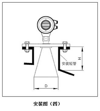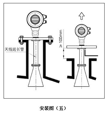 2.如果喇叭直徑大于安裝短管的直徑,包括延伸管在內的天線需要從容器里面安裝,并將儀表抬高。選擇延伸管使儀表至少抬高100mm。